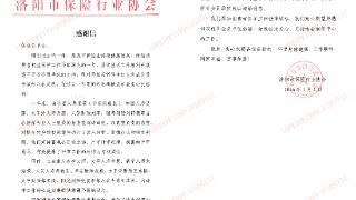 平安产险洛阳中心支公司收到洛阳市保险行业协会感谢信