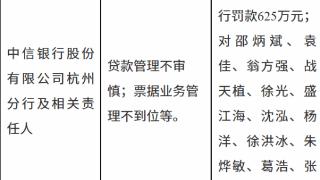 中信银行杭州分行因贷款管理不审慎等被罚款625万元 责任人同步领罚